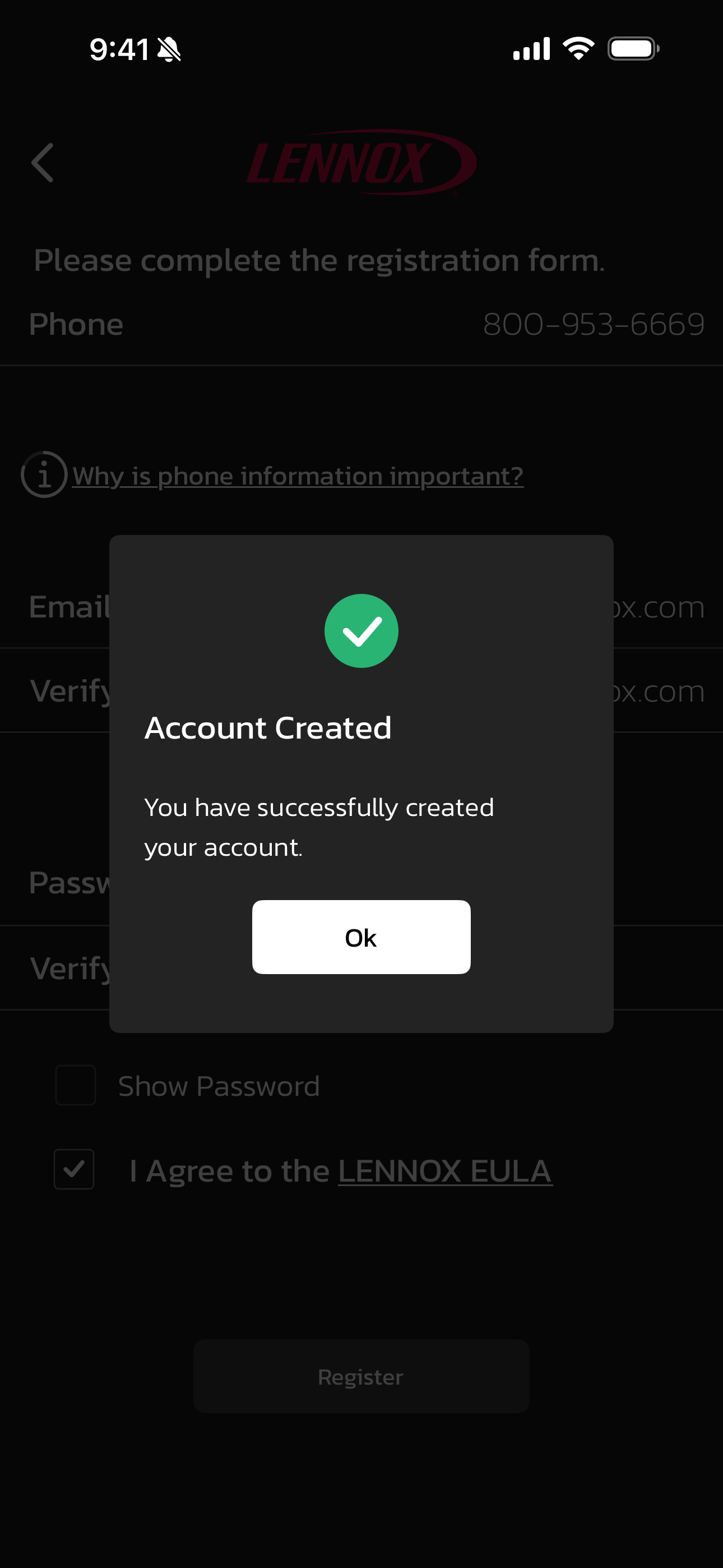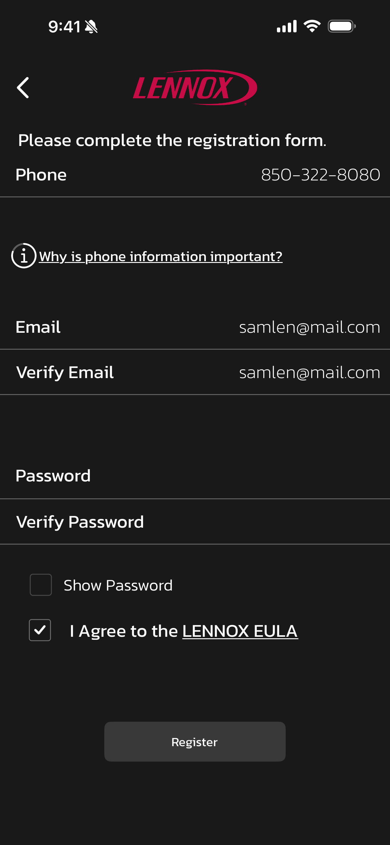 - Complete the registration form by filling in your phone number, email address, and password. Be sure to verify both email and password. Select the box for "I agree to the LENNOX EULA".
