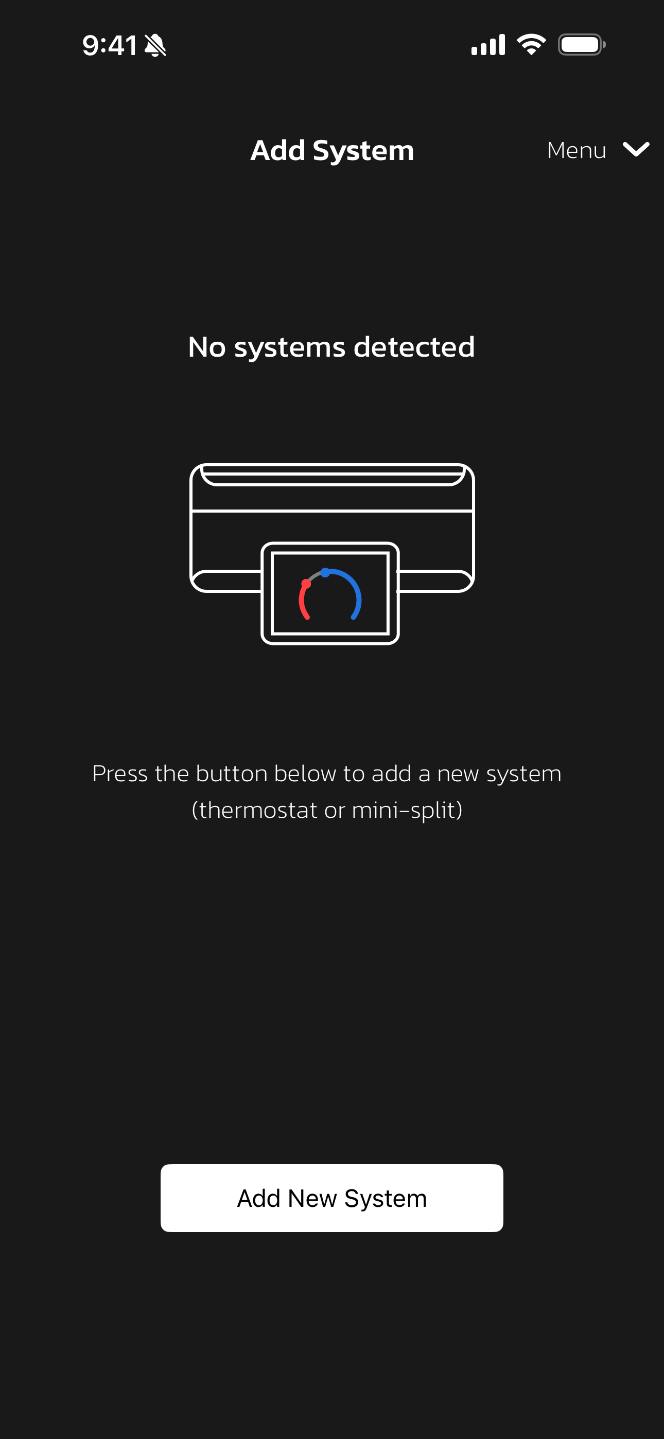 - Upon completing registration or accessing your app prior to adding a system, you will be prompted to Add New System.