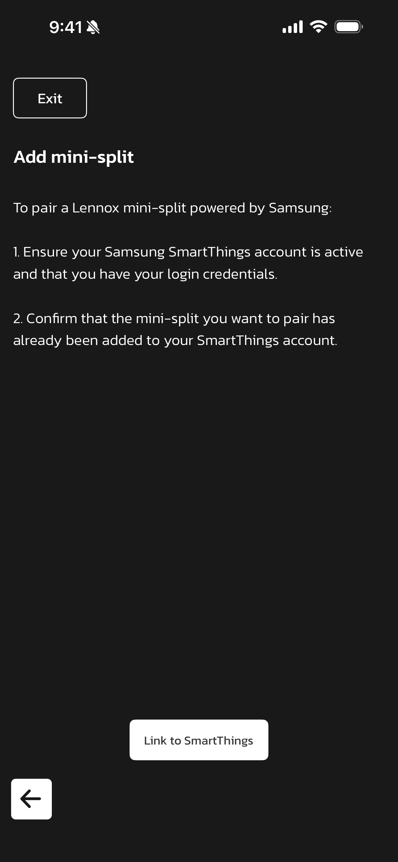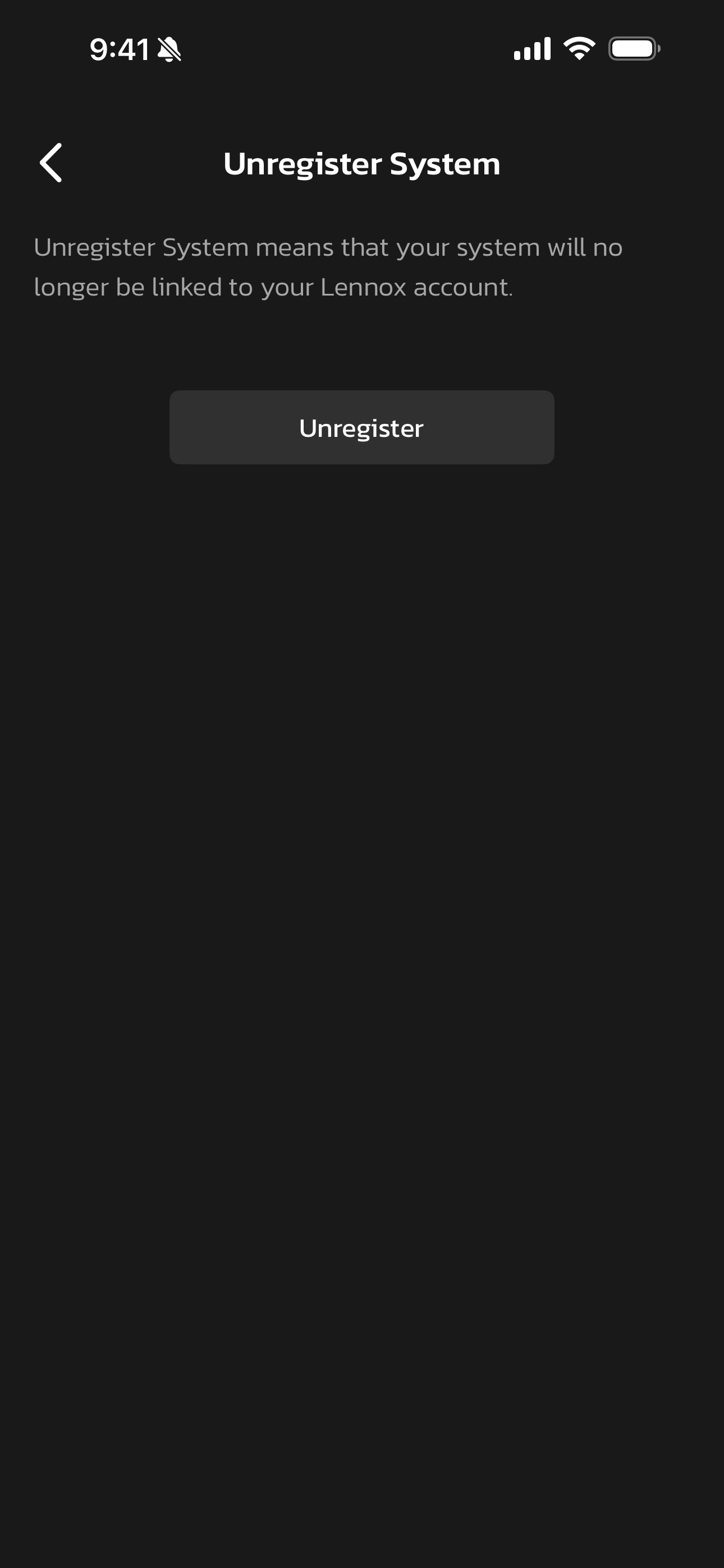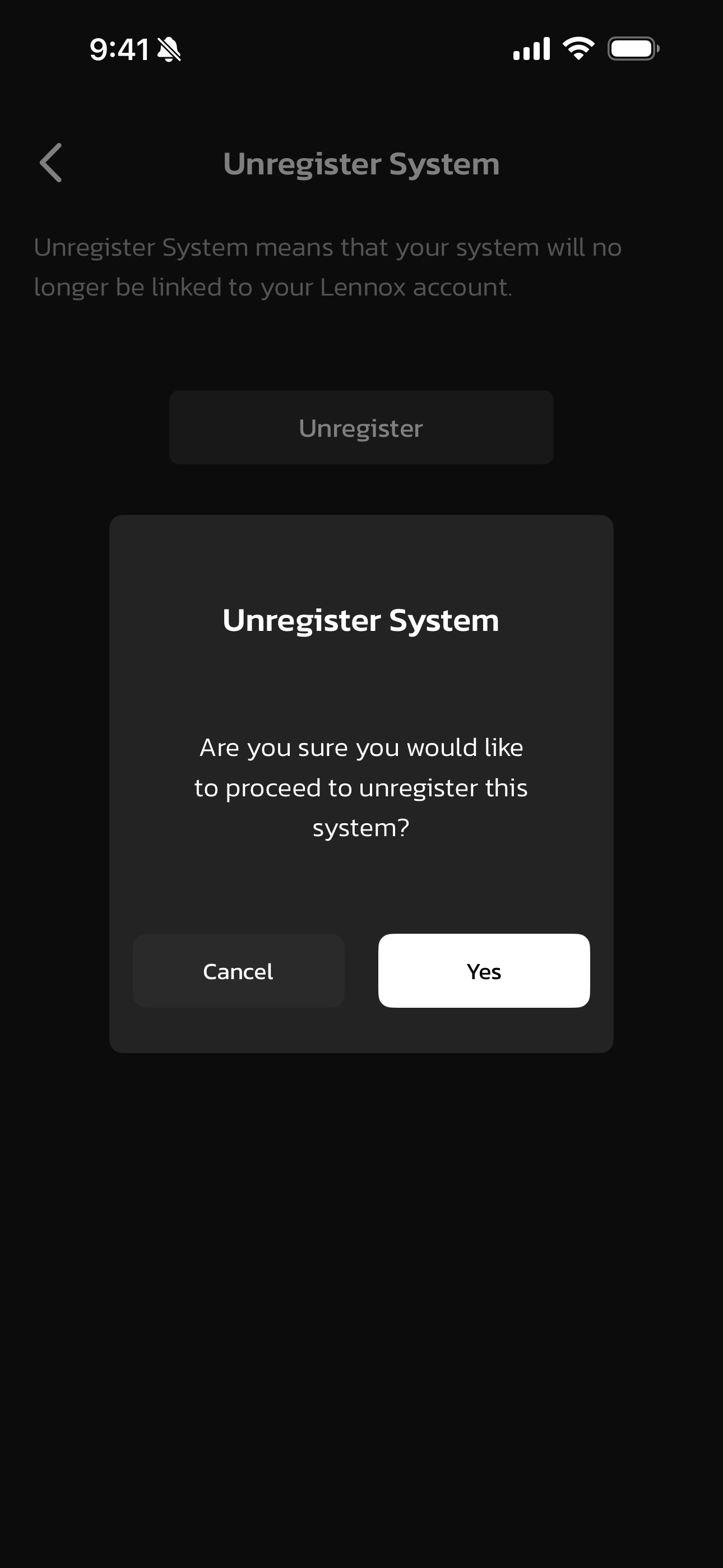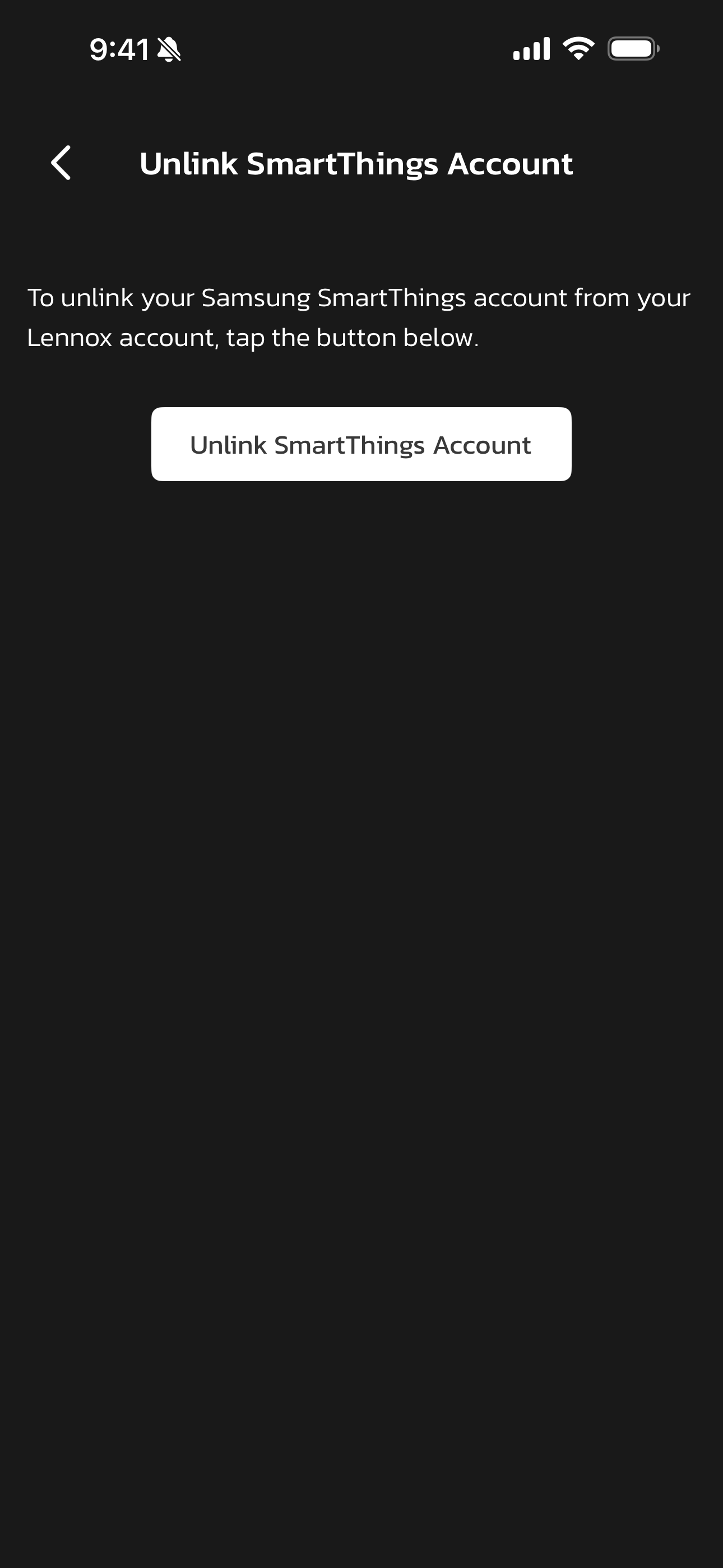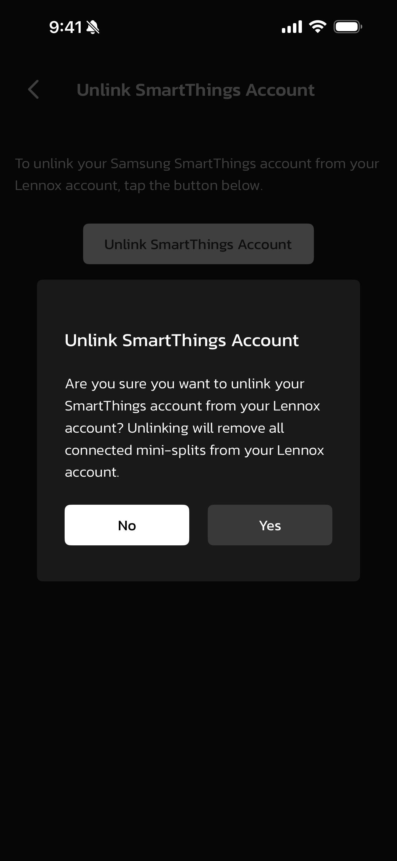 - Select Yes. Your SmartThings account has now been unlinked from your Lennox account, and all connected Mini-Splits have been removed from your Lennox account.