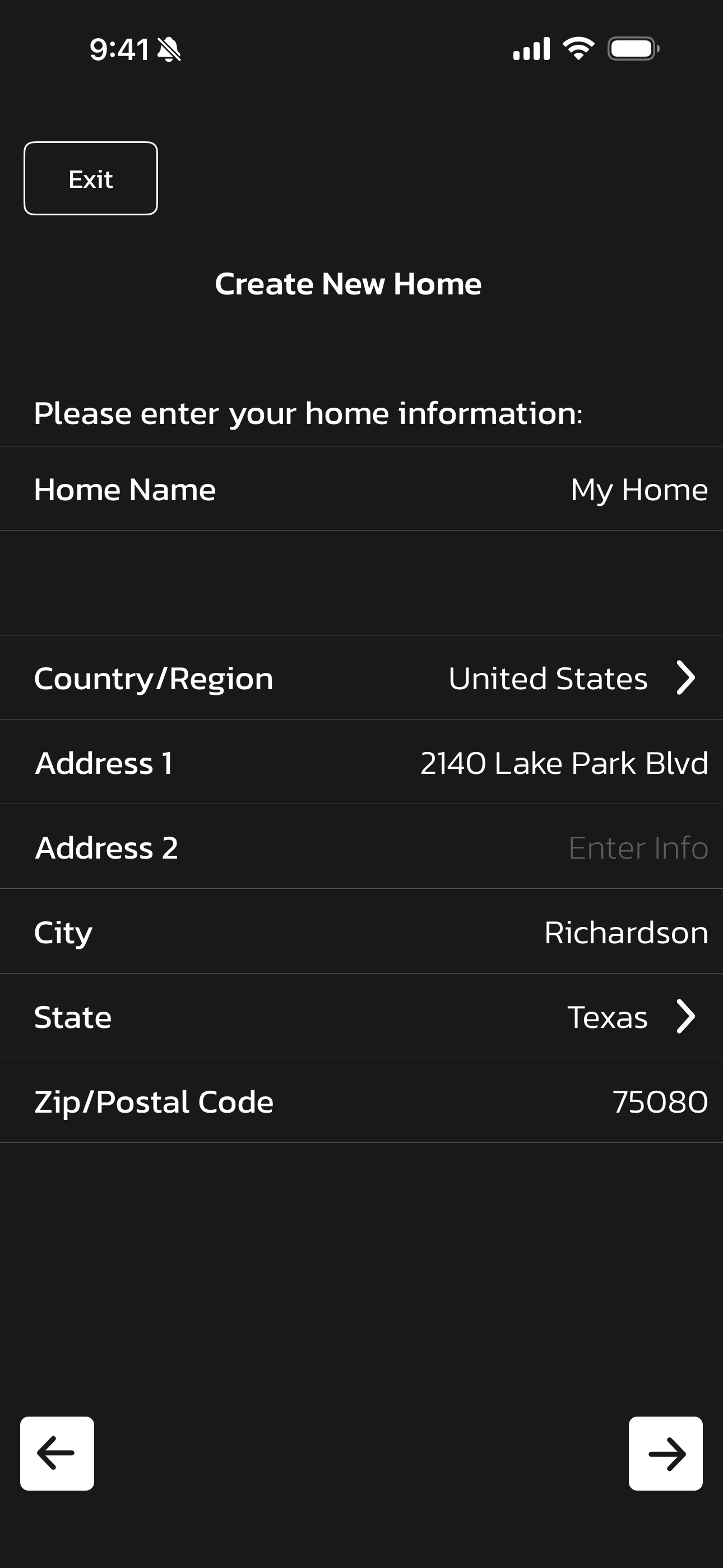 - Enter a Home Name, Country, Address, City, State, and Zip code and then click on the arrow to the bottom right to continue.
