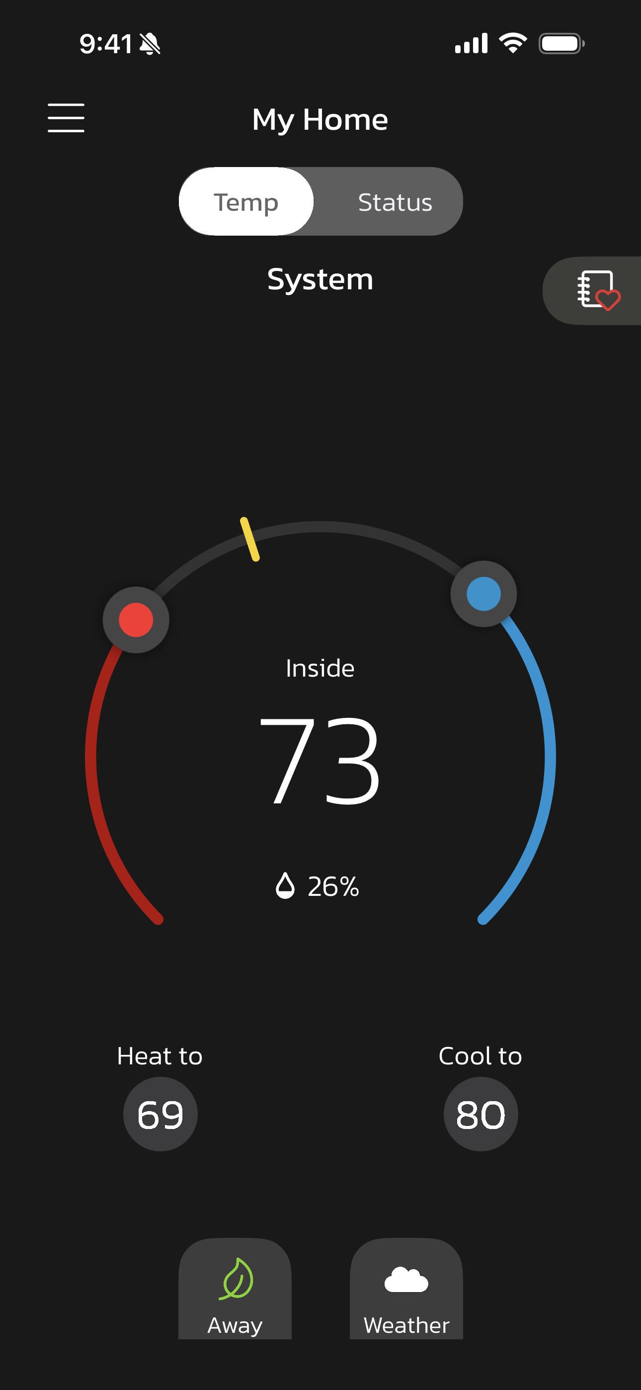 You can swipe left or right on your screen to rotate through the Temp, Status & My Home screens. You can also tap on each name to access that screen.