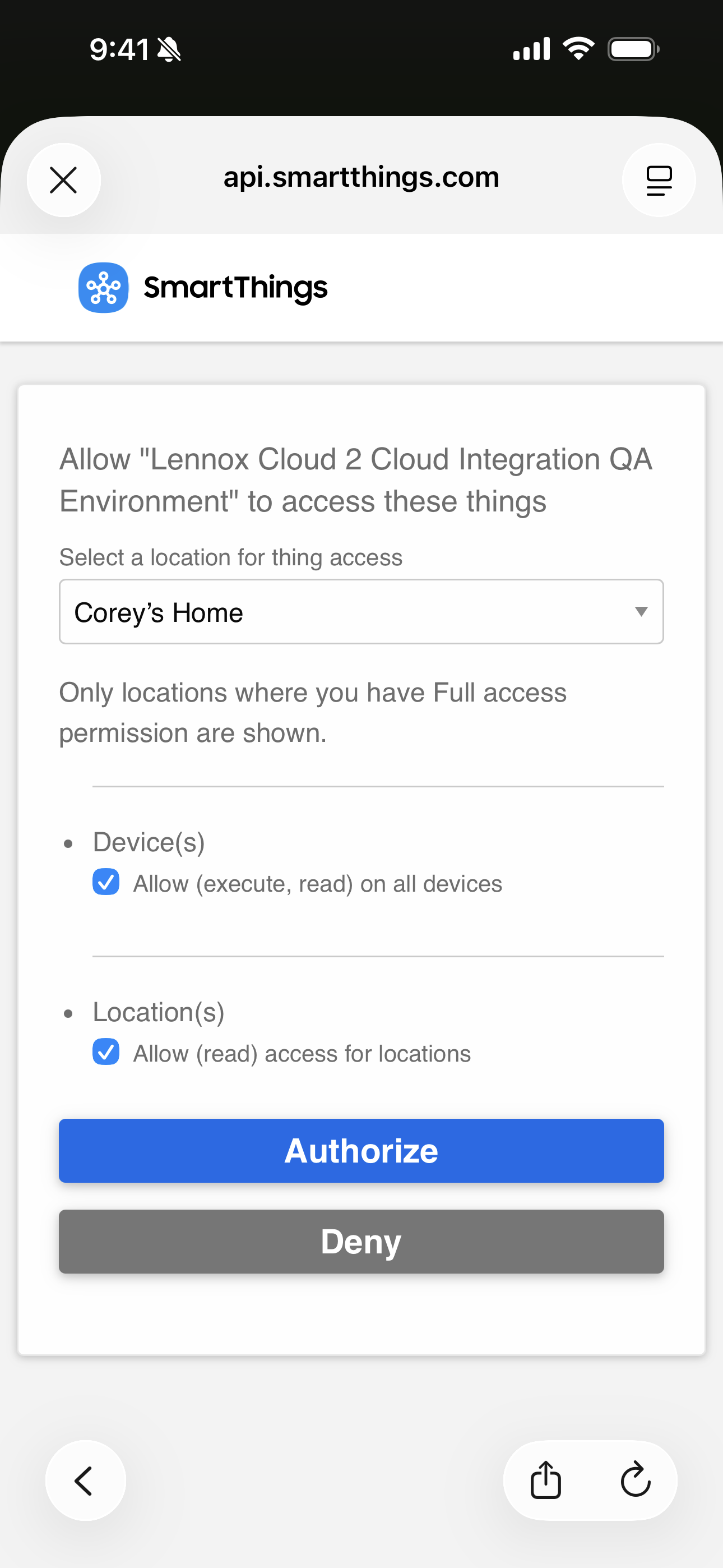 - After authenticating, you will select a location to allow Lennox Cloud 2 Cloud to access.
